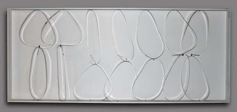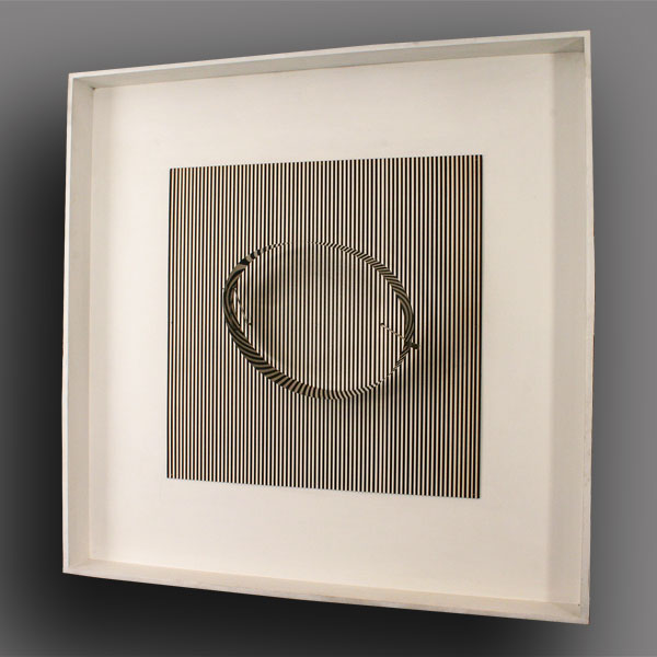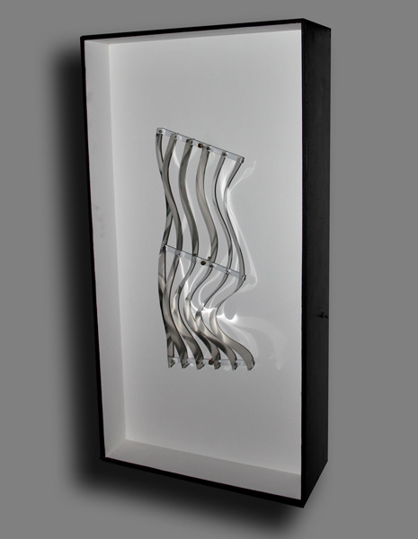 Este mismo principio fue aplicado utilizando cintas de acero inoxidable pulido, a veces sobre un fondo rayado del cual reflejaban sus rayas deformándolas con su movimiento. Otras veces sobre fondo blanco donde, además de las deformaciones de las cintas, la incidencia de la luz era evidente provocando reflejos en el fondo blanco, lo cual me lleva lógicamente a realizar experiencias aplicando la luz artificial en forma rasante.