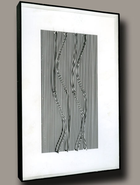 Le même principe utilise par ailleurs des rubans d'acier inoxydable poli. Placés devant un fond rayé, ils recueillent et déforment les raies dans leur mouvement. Placés parfois sur un fond blanc, l'incidence évidente de la lumière s'ajoute aux déformations des rubans, ce qui m'amena logiquement aux recherches avec la lumière artificielle dirigée.