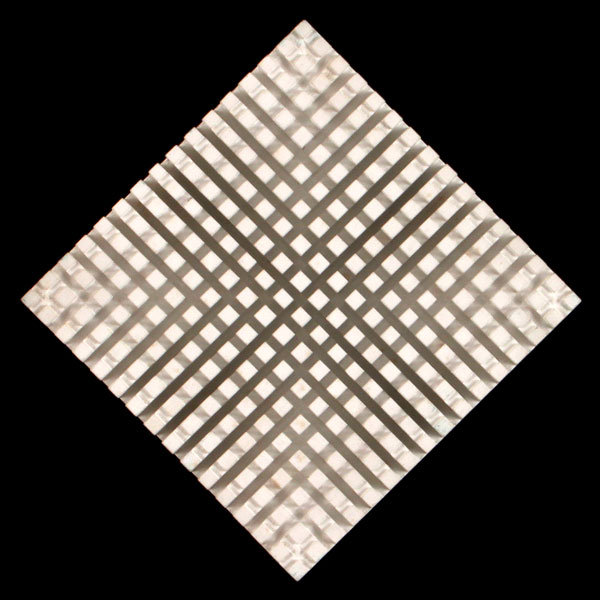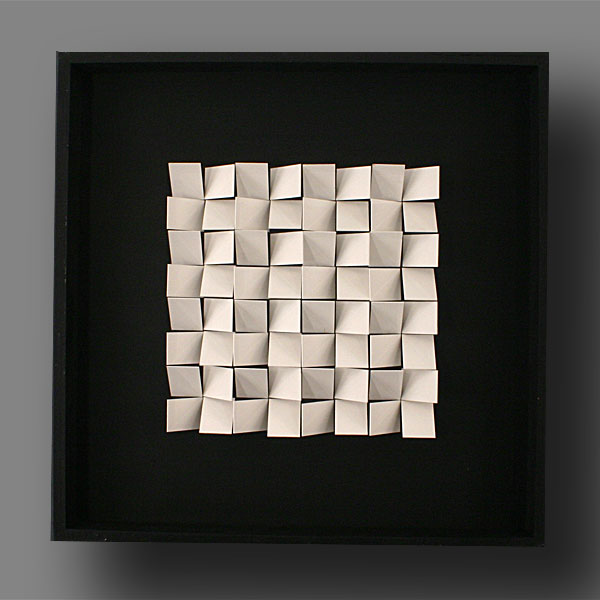 Sometimes I used as preference white, black and grey gouaches I painted the year before. I took back the principle of progression but this time I applied it with different levels or to the same elements (inclined plan) with 4 positions alternatively distributed to the surface. In other cases, the variation of the elements created a modulated surface. Those reliefs were first made in cardboard and wood. The light could freely play on them changing from levels and angles; then I did other experiments with little metallic plates regularly distributed, perpendicular with a white background. In this experiment the shade of light, shadow and reflections were primordial; it was a sort of trap of light. The material elements (the metallic plates) were vanishing to blend with the reflections of forms, shadows and all the variations prorogued by the different view angles. With those reliefs I experienced the implications of different elements outside the object; like the light incidence or the multiplication of the view point made possible by the displacement of the viewer.