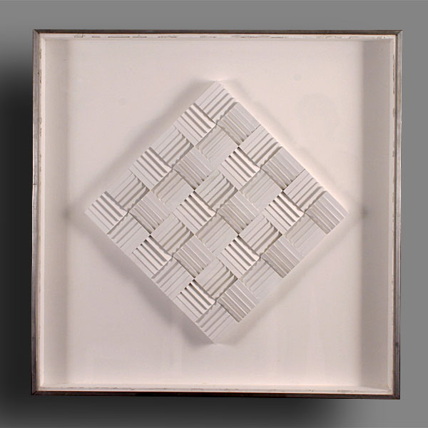 En algunos casos, el punto de referencia eran los gouaches a base de blanco, negro y gris, que habla realizado el año anterior. En ellos retomaba el principio matemático de las progresiones, pero aplicado en estos casos a variaciones de niveles o bien a un mismo elemento (un plano inclinado) con cuatro posiciones distribuidas alternativamente sobre una superficie. En otros casos la suma de elementos que variaban progresivamente creaba una superficie modulada. Estos relieves los realizaba previamente en cartón y madera. La luz jugaba sobre ellos libremente y con intensidad diferente según los ángulos o los niveles. Después realicé otras experiencias con numerosas plaquitas metálicas distribuidas regularmente y colocadas perpendicularmente a un fondo plano de color blanco. En esta experiencia el juego de luz y sombra y de los reflejos era primordial y constituía como una especie de trampa de luz. Los elementos reales (las plaquitas metálicas) perdían su presencia y su realidad se confundía con las formas producidas por los reflejos, las sombras y la variabilidad de los puntos de vista. Con estos relieves experimentaba la incorporación de elementos variables exteriores al propio objeto, es decir, con las diferentes formas de incidir la luz y con la multiplicidad de los puntos de vista que se posibilitaban con el desplazamiento del espectador.