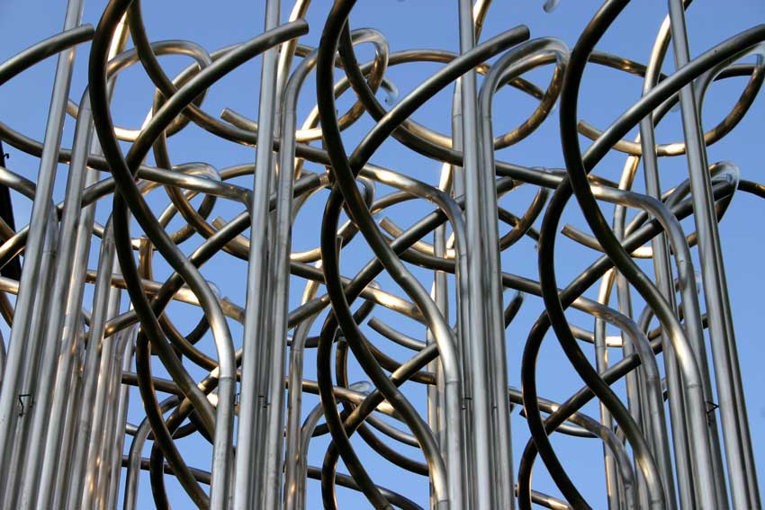 Las obras actuales no son virtuales. Son real, con la presencia contundente del acero inox, a pesar que esta materia con su superficie satinada, se presta por su manera de agarrar la luz a múltiples cambios.