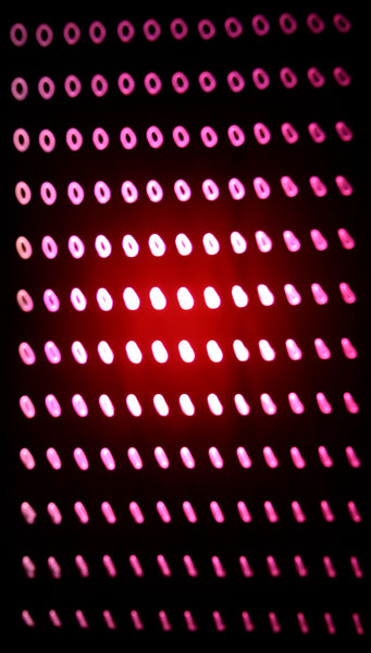 In a similar way, but with more simple themes, I made in 1968, 2 other cells: one was covered of luminous and parallel ray of lights 30 cm away with constant vibration, and another with curved walls sweeping over all their length with vertical lights which were moving left and right with irregular spaces and different speed of light.
