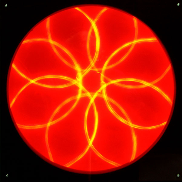 Avec la première formule, je réalisai quelques expériences utilisant plusieurs sources de lumières qui tracent un dessin sur la plaque circulaire quand celle-ci tourne à grande vitesse.