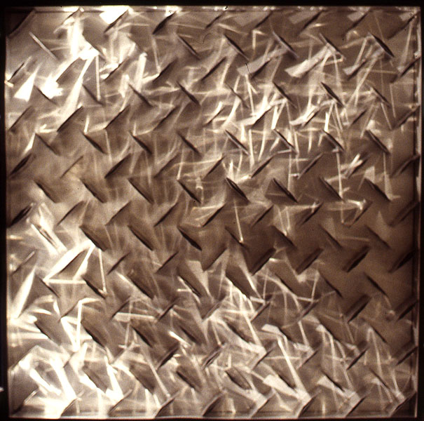 D'autres expériences avec la lumière dérivent des éléments mobiles originellement destinés à l'intérieur des boites. Sur la base de la réflexion de la lumière sur un fond à travers de petites plaques en plexiglas ou en métal, une série d'expériences combine l'emplacement des sources de lumière, l'inclinaison des éléments suspendus, la forme des fonds. Cette série m'amena à réaliser, en 1962, un ensemble destiné à une chambre blanche dans l'obscurité.