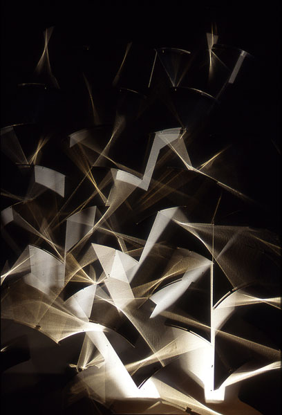 The ensemble was laid out in the middle of a room; the suspended elements received 4 rays of light and distributed their reflections horizontally, vertically and obliquely on the wall, the ceiling and the floor.