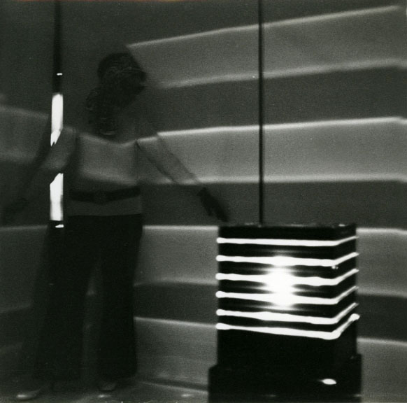 De la même façon, mais avec des thèmes plus simples, je fis en 1968 deux autres cellules, dont une couverte de lignes lumineuses parallèles avec un écart d'environ 30 centimètres, en constante vibration, et l'autre avec des murs courbes balayes sur toute leur longueur de lumières verticales qui se déplacent de gauche à droite à des intervalles irréguliers et à des vitesses différentes.