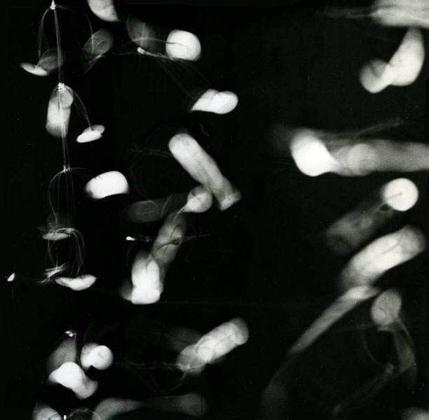 A la même époque, je réalisai d'autres expériences pour visualiser des rayons lumineux dans l'espace. D'abord, j'essayai de suspendre, dans de petites boîtes en plexiglas transparent, des particules au moyen d'air, afin de faire traverser ces boîtes par des rayons en mouvement, mais j'ai fini par utiliser de l'eau dans de petits aquariums. L'eau, colorée avec de l'aniline fluorescente, rend parfaitement visibles les rayons lumineux qui la traversent. A partir de cette expérience