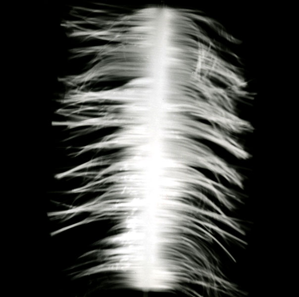 In 1962, I did other experiments using a ray of artificial light; some of them consist to project a ray of light on a cylinder which reflected the ray and distorted it on a wooden white circle which was the bottom of the cylinder. The ray was then intercepted by mobile elements which fractioned it by different manners. The visual results on the white circle were a constant and imperceptible game of shadows and lights, which were previously set. The same principal of shaved light was used to other experiments.