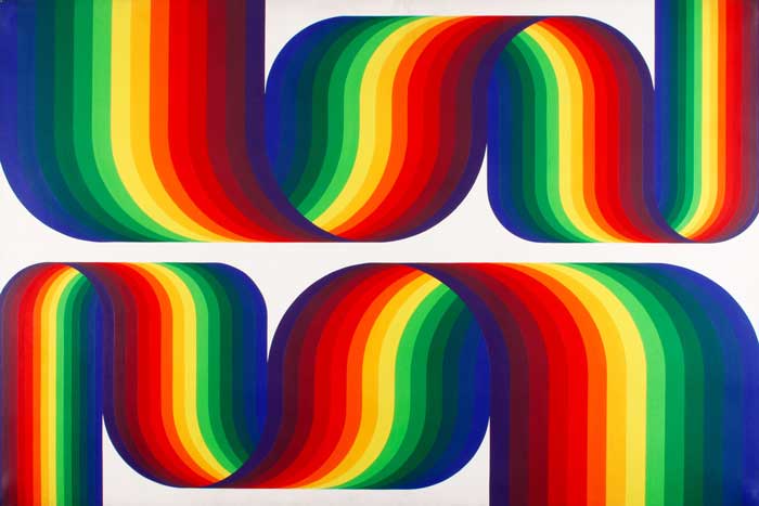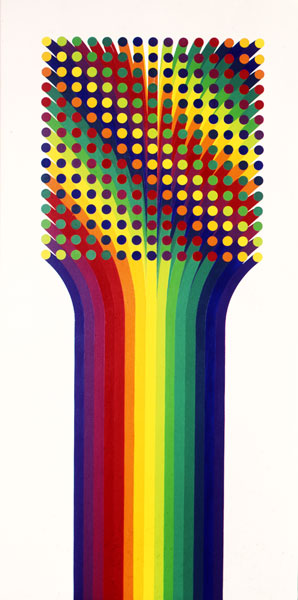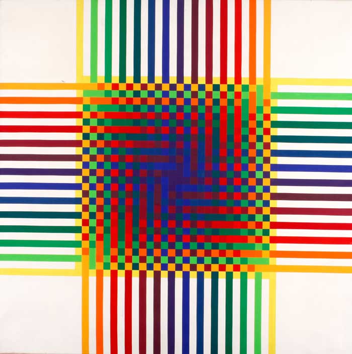 A partir de esa gama de 14 colores comencé a hacer combinaciones simples de una o dos formas en desplazamiento horizontal, yuxtaponiendo cuatro gamas desarrolladas verticalmente y horizontalmente o en diagonal. Después, sobre esas cuatro gamas yuxtapuestas cubriendo toda la superficie, he superpuesto otras cuatro gamas. Estas combinaciones, nacidas de sistemas rigurosos y simples, eran múltiples. Trabajaba con tempera sobre cartón, en pequeño formato y en plástico transparente. Este último procedimiento, me permitía obtener por superposición toda clase de permutaciones. Luego hice un pequeño aparato con bandas transparentes donde estaban mis gamas de colores y haciéndolos permutar se obtenía un número increíble de combinaciones.