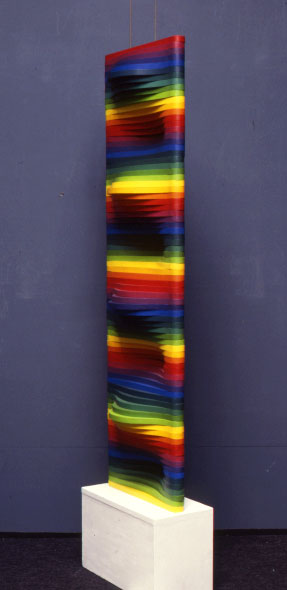 Dans toutes ces démarches, ce qui m'impressionnait, c'était la quantité de changements possibles contenue dans chacune des programmations. Mon plaisir était d'imaginer toutes ces variations se succédant dans le temps, et mes calculs de probabilité m'amenaient à considérer un autre phénomène: la durée indéterminée. Chaque gouache ou chaque tableau produit par telle ou telle combinaison était pour moi un moment particulier de tout ce mouvement de couleurs en changement continuel qui traînait dans ma tête. Par la suite, dès fin 1959, je me suis mis à imaginer des mécanismes pour faire ressortir ce potentiel de variations. Le mouvement réel est apparu dans mes recherches, la multiplication d'images, la transparence, la couleur dans l'espace, la lumière... Toutes ces recherches entreprises voici douze ans, je les ai revues, ordonnées, agrandies, je leur ai donné une meilleure forme plus visible pour les présenter aujourd'hui.