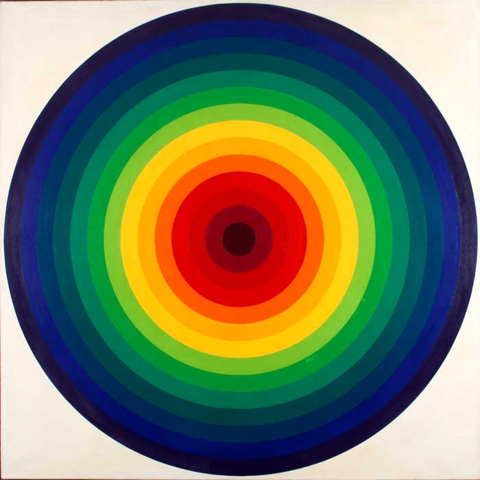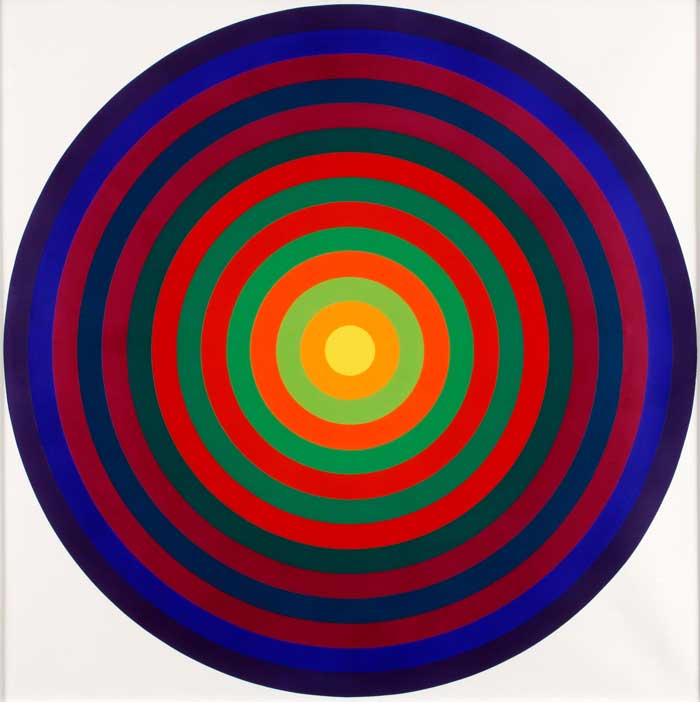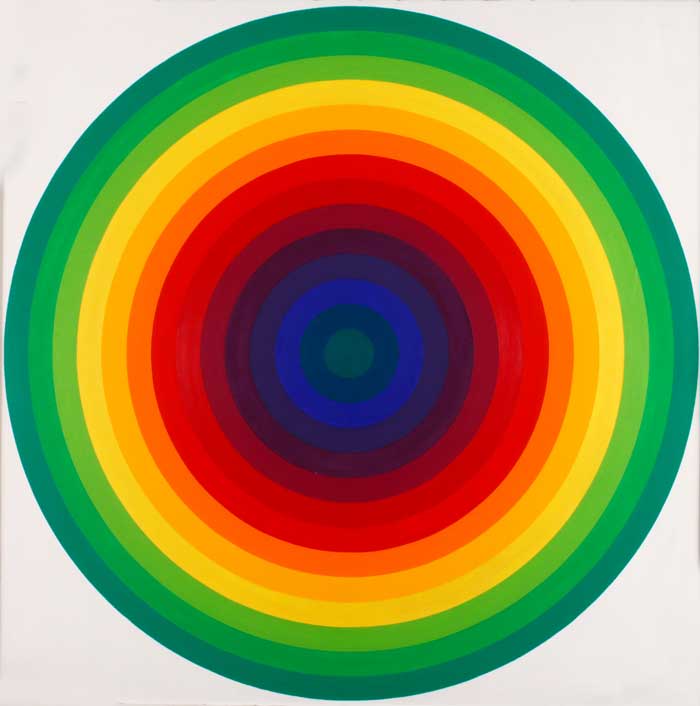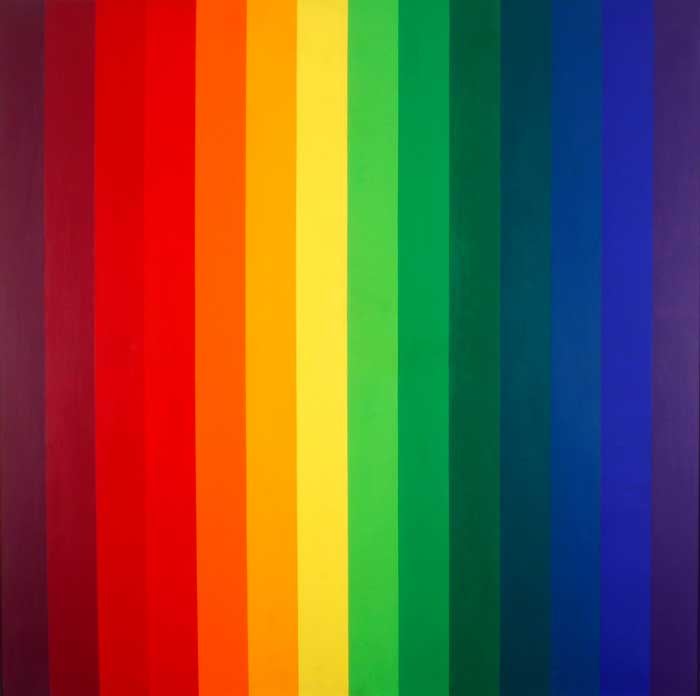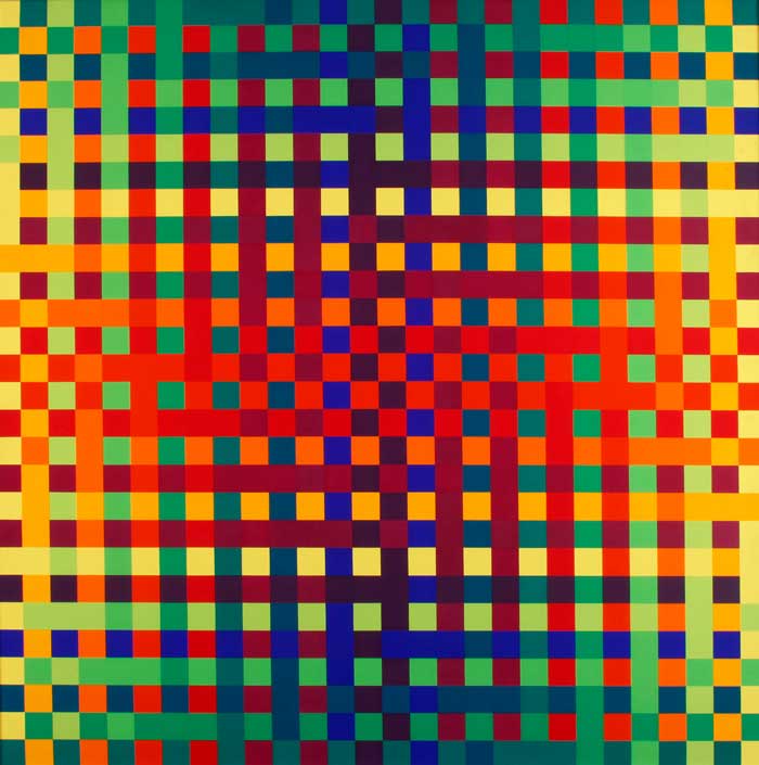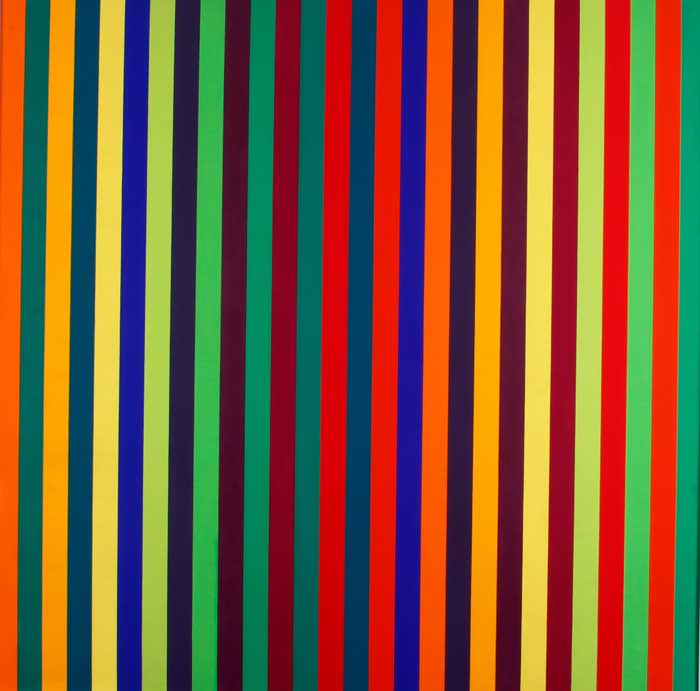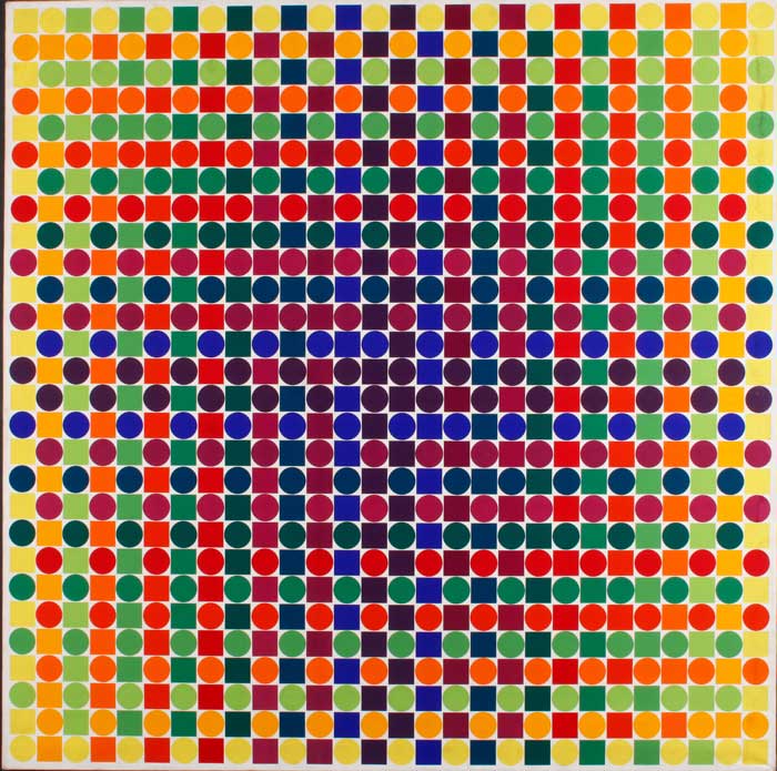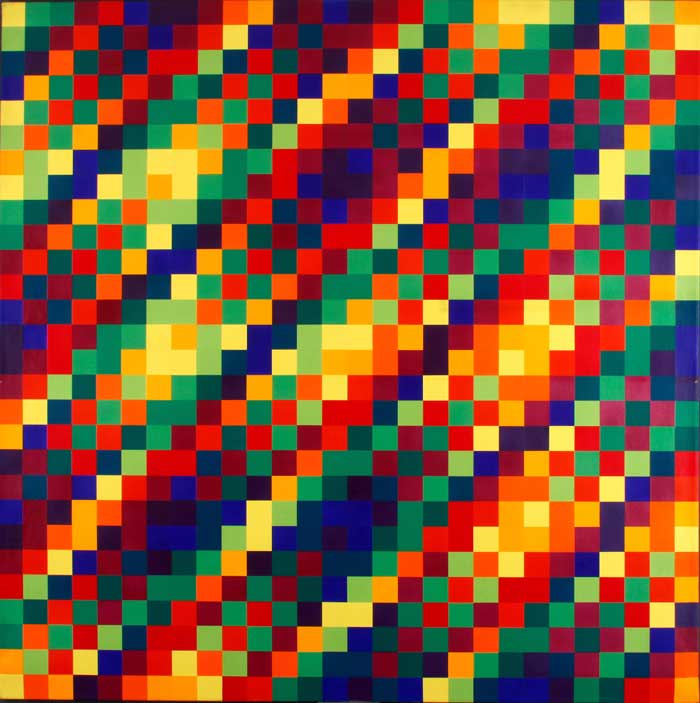 J'ai entrepris des recherches avec la couleur, en 1959, en prenant soin de ne pas faire du colorisme. J'ai appliqué à la couleur le même traitement qu'aux formes. Si je travaillais avec la couleur, ce n'était donc nullement pour faire un tableau bleu, " chaud ", etc. J'ai commencé par utiliser non pas quelques couleurs mais toutes. Les couleurs, je les voulais pures, elles n'étaient dégradées ni par le noir ni par le blanc. Je me suis interdit d'employer d'autres couleurs que celles choisies au départ. Les quatorze couleurs, bien que limitées, me semblaient pouvoir résumer toutes les variations possibles de mélanges chromatiques.