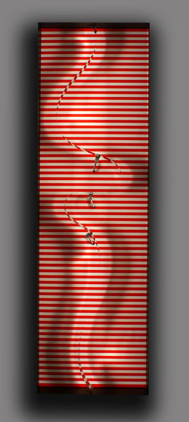 The same principle uses polish stainless steel ribbons placed in front of a stripped background. They gather and distort the lines in their movements. Place on a white screen the sharp incidence of light ads to the distortion of the ribbons; this led me to experiment with artificial and directed light.