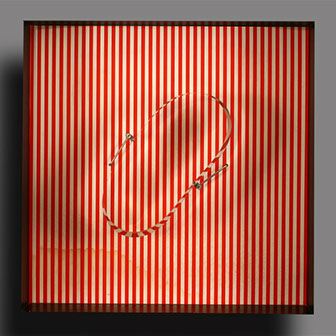 Le même principe utilise par ailleurs des rubans d'acier inoxydable poli. Placés devant un fond rayé, ils recueillent et déforment les raies dans leur mouvement. Placés parfois sur un fond blanc, l'incidence évidente de la lumière s'ajoute aux déformations des rubans, ce qui m'amena logiquement aux recherches avec la lumière artificielle dirigée.