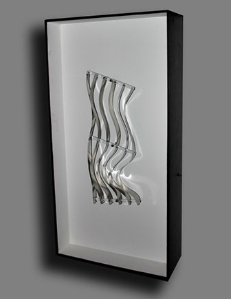 The same principle uses polish stainless steel ribbons placed in front of a stripped background. They gather and distort the lines in their movements. Place on a white screen the sharp incidence of light ads to the distortion of the ribbons; this led me to experiment with artificial and directed light.