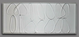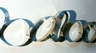 Este mismo principio fue aplicado utilizando cintas de acero inoxidable pulido, a veces sobre un fondo rayado del cual reflejaban sus rayas deformándolas con su movimiento. Otras veces sobre fondo blanco donde, además de las deformaciones de las cintas, la incidencia de la luz era evidente provocando reflejos en el fondo blanco, lo cual me lleva lógicamente a realizar experiencias aplicando la luz artificial en forma rasante.