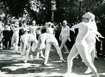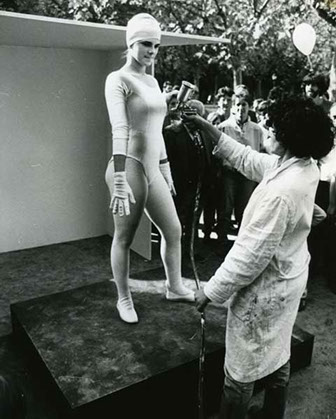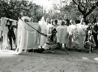 En 1966 dans les rues de Paris. Nous avons eu pas mal de problèmes avec la police qui nous pourchassait. Ceci nous empêchait de respecter l'horaire prévu, d'autant que nous passions du temps à discuter avec eux pour essayer de leur expliquer nos objectifs artistiques.