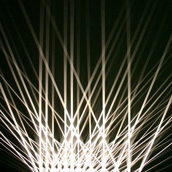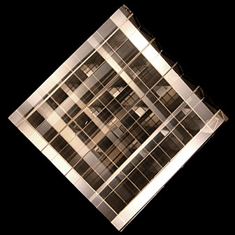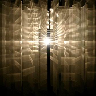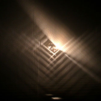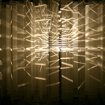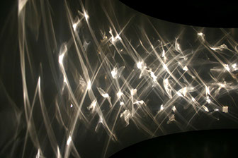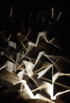 The ensemble was laid out in the middle of a room; the suspended elements received 4 rays of light and distributed their reflections horizontally, vertically and obliquely on the wall, the ceiling and the floor.