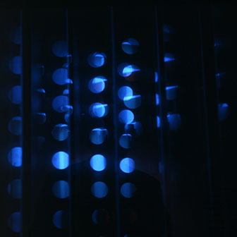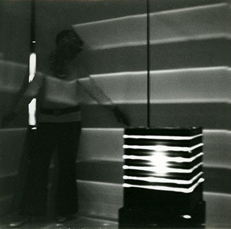 In a similar way, but with more simple themes, I made in 1968, 2 other cells: one was covered of luminous and parallel ray of lights 30 cm away with constant vibration, and another with curved walls sweeping over all their length with vertical lights which were moving left and right with irregular spaces and different speed of light.