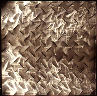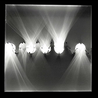 Some other experiments with the light are drawn from the mobile elements originally destined inside boxes. On the base of reflections of light on a background through small Plexiglas or metal slates, a series of experiments combined the place of the source of light, the incidence of the suspended elements, the shapes of the background. This series led me to realize in 1962 an ensemble destined to a white room in darkness.