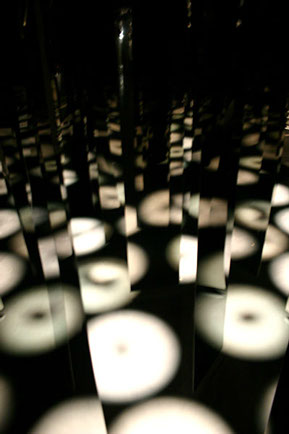To surprise the viewer, to place him in the center of a phenomenon, to embody him with visual situation, some experiments were realized in the first labyrinth our group presented at the Biennale of Paris in 1963.In this labyrinth, 3 of my proposal linked the light to reflective elements to give shape to 3 cells the viewer was invited to cross. Those experiments excluded the possibilities to apprehend the phenomenon with one look, like in the situation where traditional paintings hanged to a wall or sculpture on a stand where the viewer is turning around. On the contrary, they plunge him in a visual situation, while soliciting all around, so the image perceived in his passage is the result of his immobility in this space, the movement is having and the images which are successively produced etc…
