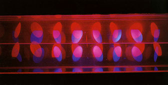 A la même époque, je réalisai d'autres expériences pour visualiser des rayons lumineux dans l'espace. D'abord, j'essayai de suspendre, dans de petites boîtes en plexiglas transparent, des particules au moyen d'air, afin de faire traverser ces boîtes par des rayons en mouvement, mais j'ai fini par utiliser de l'eau dans de petits aquariums. L'eau, colorée avec de l'aniline fluorescente, rend parfaitement visibles les rayons lumineux qui la traversent. A partir de cette expérience
