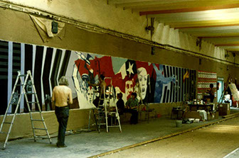 - Collective realizations of the international brigade of antifascist’s painters gathered in Venice and composed of: Balmes, Basaglia, Boriani, Eulisse, Cueco, Gamara, Le Parc, Marcos, Netto, Nunes, Perusini, Ernest Pignon, VanMeel. The brigade has realized 3 collective works; the first 12 meters high in Venice’s harbour, to support the sea freight boycott to Pinochet’s Chili by the harbor workers, and a second one in Athens for the international solidarity congress with Chili and a third one of 20 meters realized in Paris of Salvatore Allende’s resistance museum.