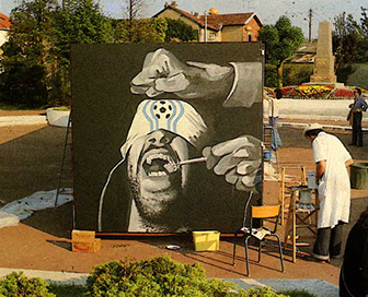 - Collective works realized by the Collective antifascist’s painters; for instance: he PSU’s fair (unified socialist party) on the theme: “a world to destroy, another to create”; we realized a series of mobiles panels, the participants had carried all around the fair.