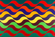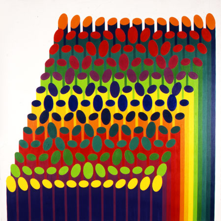 A partir de esa gama de 14 colores comencé a hacer combinaciones simples de una o dos formas en desplazamiento horizontal, yuxtaponiendo cuatro gamas desarrolladas verticalmente y horizontalmente o en diagonal. Después, sobre esas cuatro gamas yuxtapuestas cubriendo toda la superficie, he superpuesto otras cuatro gamas. Estas combinaciones, nacidas de sistemas rigurosos y simples, eran múltiples. Trabajaba con tempera sobre cartón, en pequeño formato y en plástico transparente. Este último procedimiento, me permitía obtener por superposición toda clase de permutaciones. Luego hice un pequeño aparato con bandas transparentes donde estaban mis gamas de colores y haciéndolos permutar se obtenía un número increíble de combinaciones.