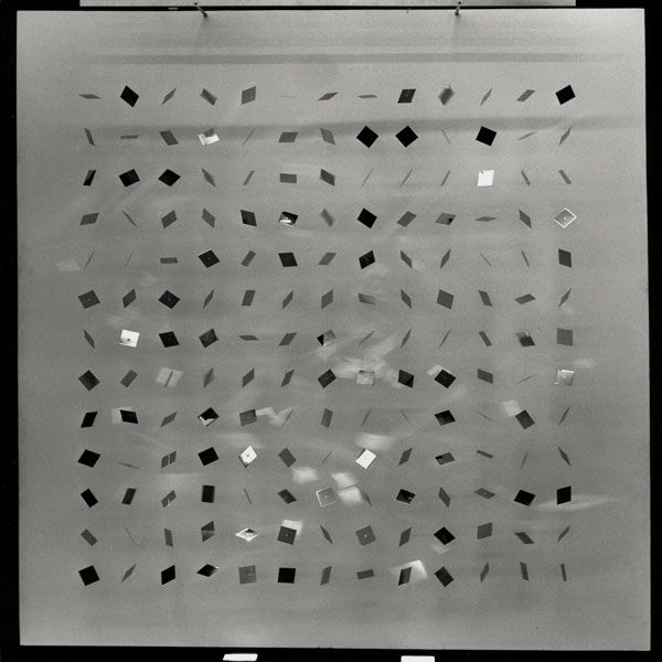 D'autres expériences avec la lumière dérivent des éléments mobiles originellement destinés à l'intérieur des boites. Sur la base de la réflexion de la lumière sur un fond à travers de petites plaques en plexiglas ou en métal, une série d'expériences combine l'emplacement des sources de lumière, l'inclinaison des éléments suspendus, la forme des fonds. Cette série m'amena à réaliser, en 1962, un ensemble destiné à une chambre blanche dans l'obscurité.