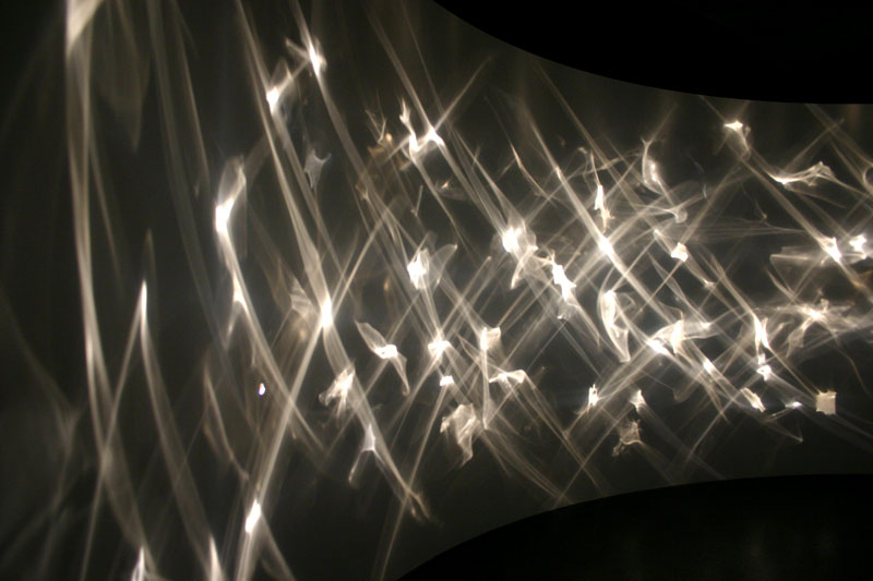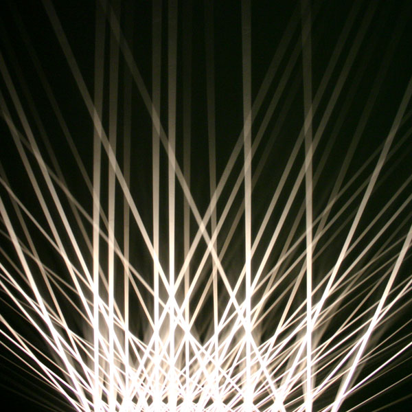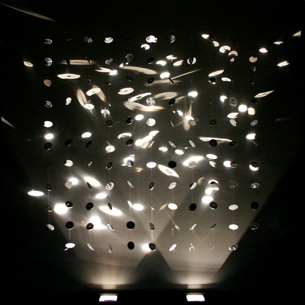 The ensemble was laid out in the middle of a room; the suspended elements received 4 rays of light and distributed their reflections horizontally, vertically and obliquely on the wall, the ceiling and the floor.