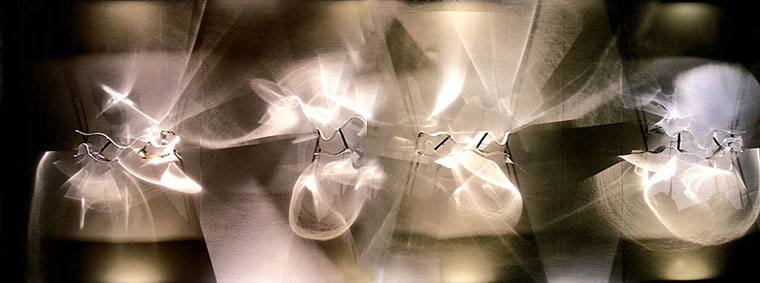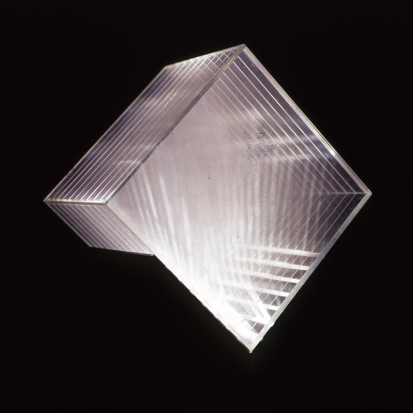 A la même époque, je réalisai d'autres expériences pour visualiser des rayons lumineux dans l'espace. D'abord, j'essayai de suspendre, dans de petites boîtes en plexiglas transparent, des particules au moyen d'air, afin de faire traverser ces boîtes par des rayons en mouvement, mais j'ai fini par utiliser de l'eau dans de petits aquariums. L'eau, colorée avec de l'aniline fluorescente, rend parfaitement visibles les rayons lumineux qui la traversent. A partir de cette expérience