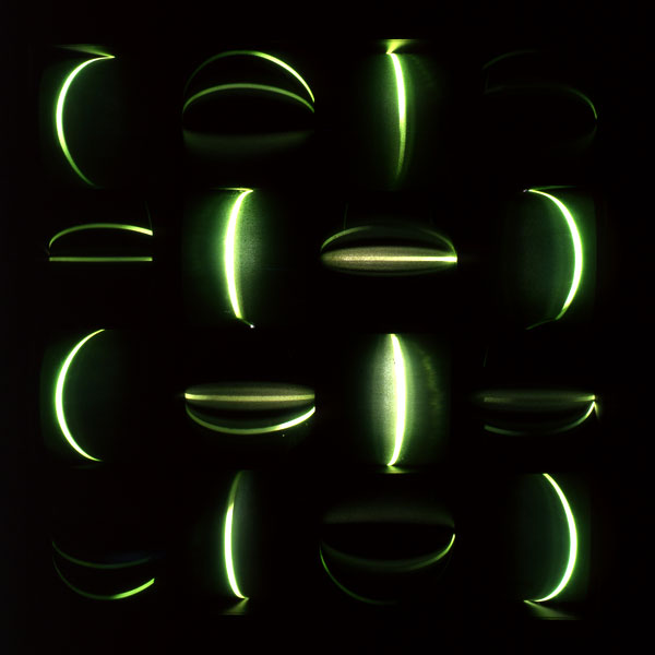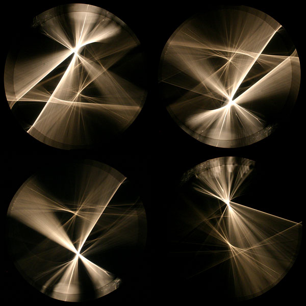Avec la première formule, je réalisai quelques expériences utilisant plusieurs sources de lumières qui tracent un dessin sur la plaque circulaire quand celle-ci tourne à grande vitesse.