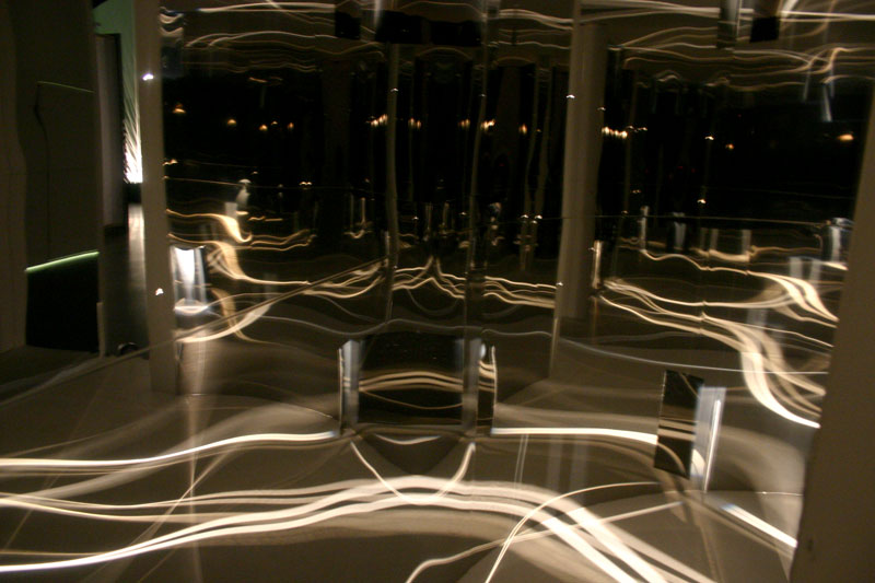 In a similar way, but with more simple themes, I made in 1968, 2 other cells: one was covered of luminous and parallel ray of lights 30 cm away with constant vibration, and another with curved walls sweeping over all their length with vertical lights which were moving left and right with irregular spaces and different speed of light.