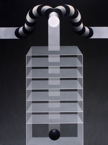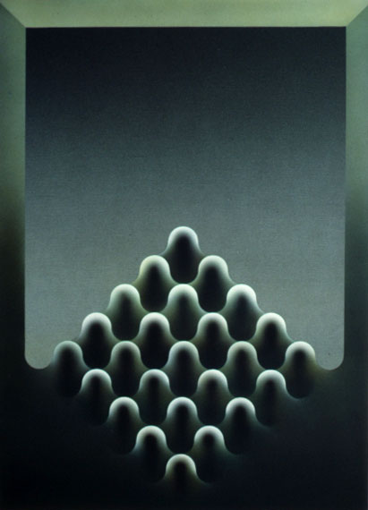 En los trabajos recientes esa constante se mantiene. Ellos son el producto de elementos muy simples puestos en relación a la espera que una riqueza, si riqueza hay, sea el producto de una tensión particular que sobrepasa el carácter de cada elemento constituyendo el núcleo del cuadro. Para que esa evidencia sea percibida, los elementos del cuadro deben ser los menos posibles y lo más anónimos que se pueda, para que el interés se sitúe en un plano intermedio entre el espectador y el cuadro, de manera que haya un despegue de la superficie banal hecha de formas y colores y que una presencia inmaterial flote ahí a algunos centímetros del cuadro, o tal vez detrás de él, en un mundo a penetrar.