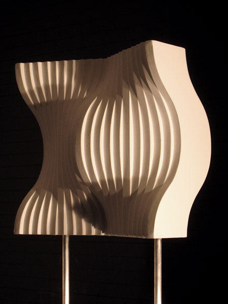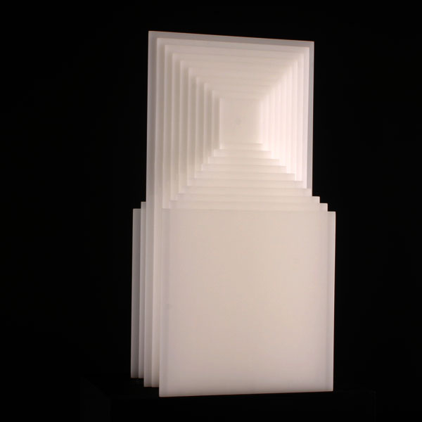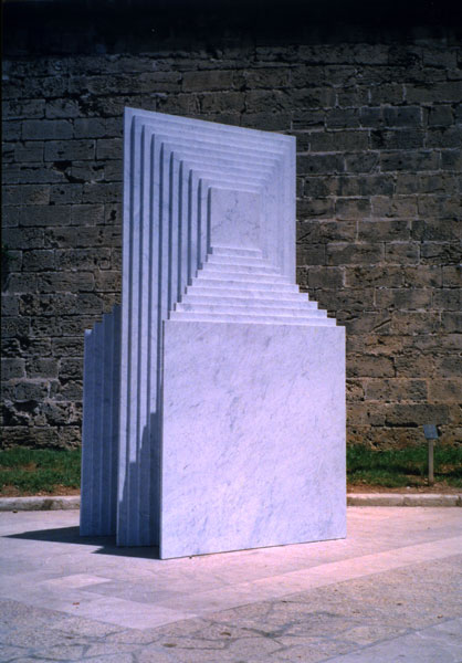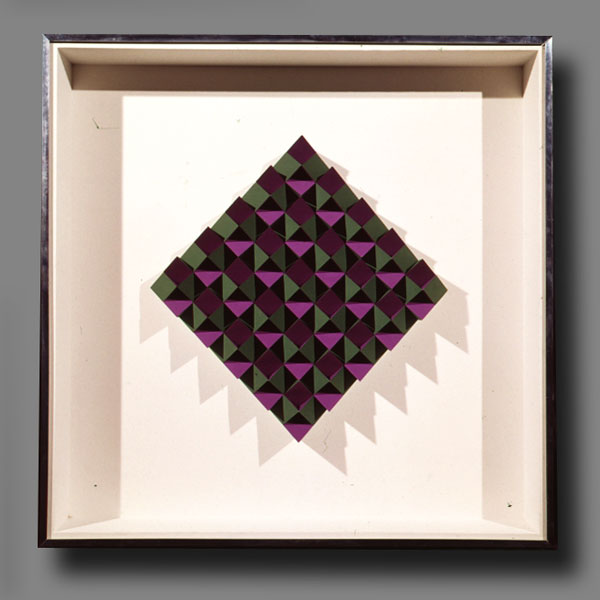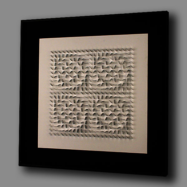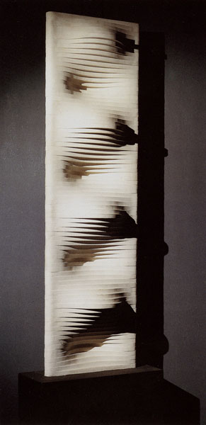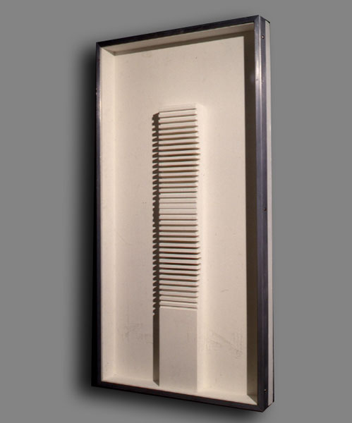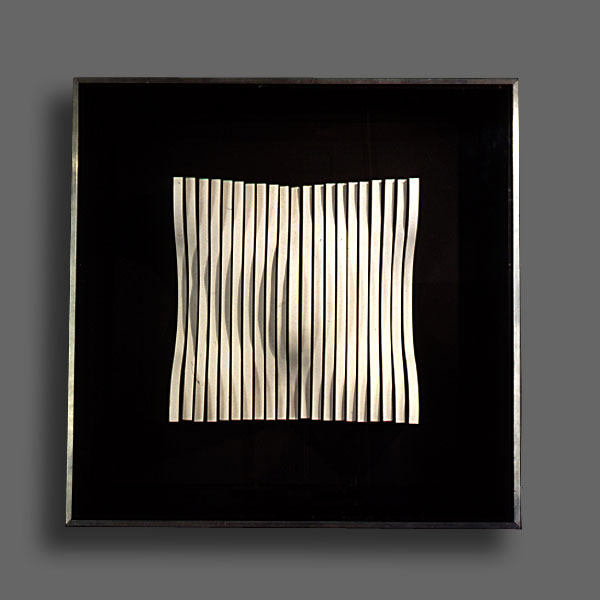 En algunos casos, el punto de referencia eran los gouaches a base de blanco, negro y gris, que habla realizado el año anterior. En ellos retomaba el principio matemático de las progresiones, pero aplicado en estos casos a variaciones de niveles o bien a un mismo elemento (un plano inclinado) con cuatro posiciones distribuidas alternativamente sobre una superficie. En otros casos la suma de elementos que variaban progresivamente creaba una superficie modulada. Estos relieves los realizaba previamente en cartón y madera. La luz jugaba sobre ellos libremente y con intensidad diferente según los ángulos o los niveles. Después realicé otras experiencias con numerosas plaquitas metálicas distribuidas regularmente y colocadas perpendicularmente a un fondo plano de color blanco. En esta experiencia el juego de luz y sombra y de los reflejos era primordial y constituía como una especie de trampa de luz. Los elementos reales (las plaquitas metálicas) perdían su presencia y su realidad se confundía con las formas producidas por los reflejos, las sombras y la variabilidad de los puntos de vista. Con estos relieves experimentaba la incorporación de elementos variables exteriores al propio objeto, es decir, con las diferentes formas de incidir la luz y con la multiplicidad de los puntos de vista que se posibilitaban con el desplazamiento del espectador.