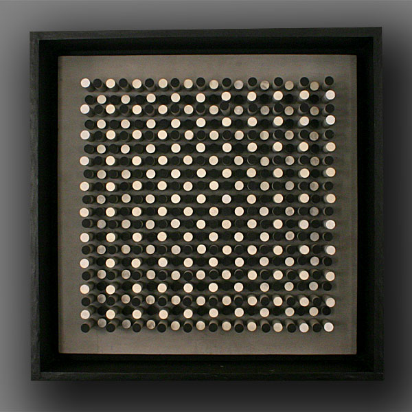 Sometimes I used as preference white, black and grey gouaches I painted the year before. I took back the principle of progression but this time I applied it with different levels or to the same elements (inclined plan) with 4 positions alternatively distributed to the surface. In other cases, the variation of the elements created a modulated surface. Those reliefs were first made in cardboard and wood. The light could freely play on them changing from levels and angles; then I did other experiments with little metallic plates regularly distributed, perpendicular with a white background. In this experiment the shade of light, shadow and reflections were primordial; it was a sort of trap of light. The material elements (the metallic plates) were vanishing to blend with the reflections of forms, shadows and all the variations prorogued by the different view angles. With those reliefs I experienced the implications of different elements outside the object; like the light incidence or the multiplication of the view point made possible by the displacement of the viewer.