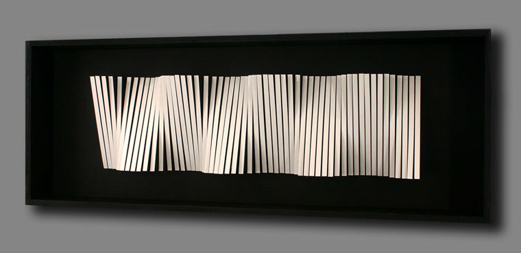 Puis je fis d'autres expériences avec de nombreuses petites plaques métalliques distribuées régulièrement, perpendiculaires à un fond blanc. Dans cette expérience, le jeu de la lumière, de l'ombre et des reflets était primordial, c'était une espèce de piège de lumière. Les éléments réels (les plaques métalliques) perdaient leur présence et leur réalité pour se confondre avec les formes produites par les reflets, les ombres et les variations engagées par les déplacements du point de vue. Avec ces reliefs j'expérimentais l'implication d'éléments variables extérieurs à l'objet, tels que les incidences de la lumière ou la multiplication des points de vue rendue possible par le déplacement du spectateur.